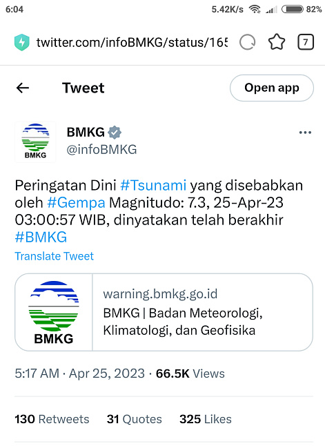 Sementara informasi dari BMKG dilangsir dari twitter@infoBMKG, sempat mengeluarkan Peringatan Dini Tsunami untuk wilayah: SUMUT. Diketahui gempa tercatat Magnitudi 7.3, 25-Apr-23 03:00:57 WIB, Lok:0.93 LS, 98.39 BT (177 km BaratLaut KEP-MENTAWAI-SUMBAR), Kedlmn: 84 Km.