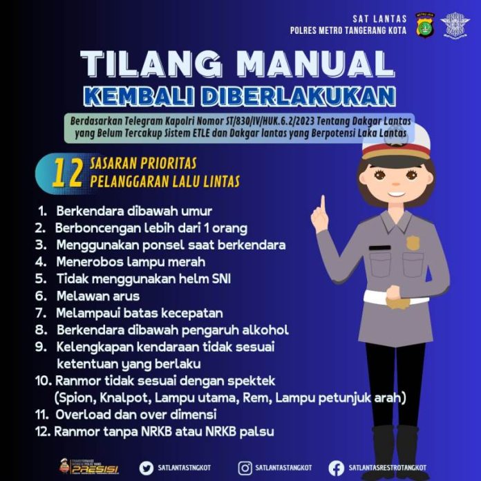 Diberlakukan nya tilang manual untuk lebih mengoptimalisasikan tilang elektronik atau E-TLE yang telah dilakukan selama ini di wilayah hukum Polres Metro Tangerang Kota, Polda Metro Jaya. Namun masih banyaknya pengendara yang melepas dan memalsukan plat nomer kendaraan untuk menghindari tilang elektronik.