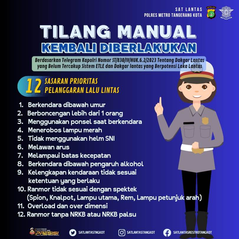 Pemberlakuan tilang manual ini berdasarkan Surat Telegram Kapolri Nomor ST/830/IV/HUK.6.2./2023, 12 April 2023.
