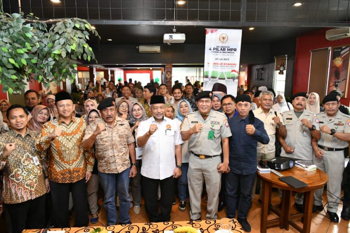 “4 pilar tersebut ialah : 1.Pancasila sebagai Dasar dan idiologi Negara. 2.UUD NRI Tahun 1945 sebagai Konstitusi Negara serta ketetapan MPR RI. 3.NKRI sebagai bentuk Negara. 4. Bhineka Tunggal Ika sebagai semboyan negara,” bebernya.