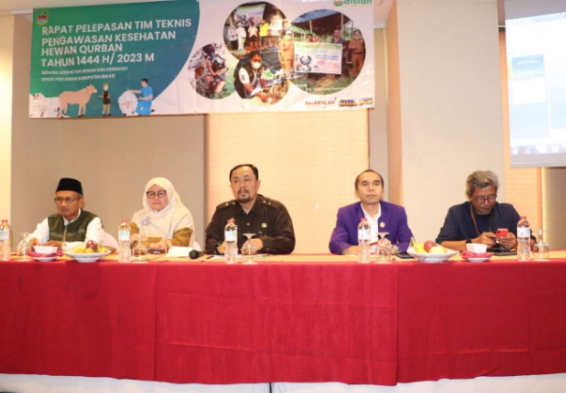 Acara pelepasan tim teknis pengawas kesehatan hewan kurban, turut dihadiri Plt Kadistan Nayu Kulsum, Ketua Perhimpunan Dokter Hewan Indonesia Jawa Barat Wilayah 5, drh. Rudi Pangabean, dan Ketua Bidang Fatwa MUI, KH Ahbab Ahfas dan Kebala Bidang Keswan dan Veteriner Disketapang Jabar drh Prijanto. (D).
