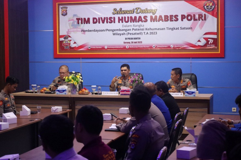 Banten,koranpelita.co – Tim Biro Penerangan Masyarakat (Penmas) Divisi Humas Polri melakukan kunjungan dalam rangka Penerangan Satuan Wilayah (Pensatwil) ke Wilayah Polda Banten bertempat di Aula Rapat Birorena Polda Banten,Kamis (20/7/2023).