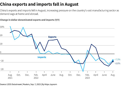 Ekspor Agustus 2023 turun 8,8 persen (yoy). Impor juga turun 7,3 persen (yoy). Bulan sebelumnya, Juli 2023, ekspor dan impor China turun masing-masing 14,5 persen dan 12,4 persen.