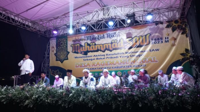 KORANPELITA.co – Ribuan warga Desa Ragemanunggal merayakan acara Maulid Nabi yang disebut ‘Ragemanunggal Bersholawat’ di Lapangan Ragemanunggal Sakti, Kecamatan Setu, Kabupaten Bekasi, pada Jumat, 27 Oktober 2023, malam.