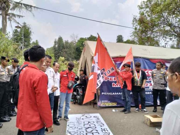Banten,koranpelita.co – Ditsamapta Polda Banten menurunkan 1 pleton personel bersama Satker pendukung lainya mengamankan aksi unjuk rasa mahasiswa GMNI di kantor KPU Provinsi Banten , Senin (23/10/20230.