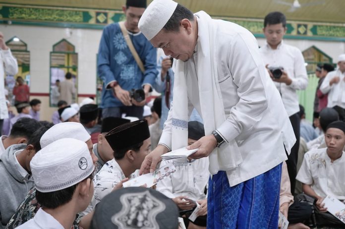 “Jadi kami keliling ke semua kabupaten/kota, tujuan kami adalah untuk membantu anak-anak, kalau bantuan pemda itu bentuknya adalah sepatu, baju dan ada perlengkapan sekolah, kalau ini uang tunai yang diberikan. Dan hari ini juga kita berikan santunan kepada anak yatim,” pungkas Gubernur Al Haris.(Rizal)