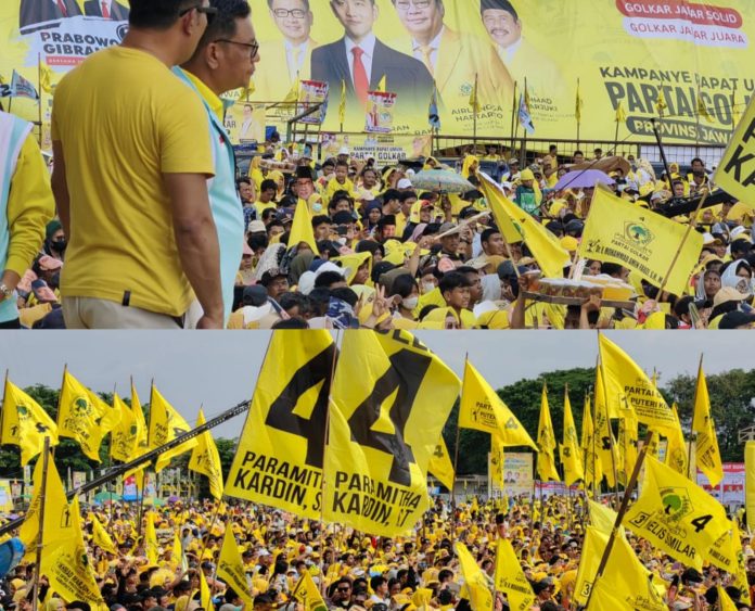 Seruan itu pun serentak dijawab oleh ribuan pendukung yang hadir, “Partai Golkar, nomor 4, Prabowo-Gibran!” teriak pendukung.