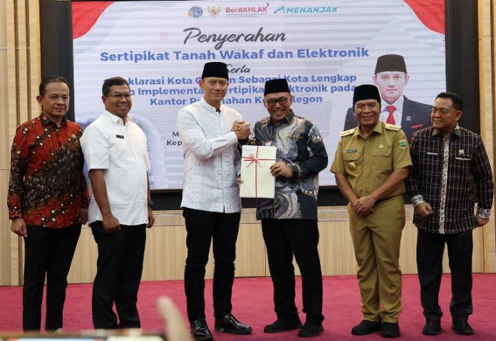 Hal itu diungkap Al Muktabar pada Penyerahan Sertipikat Tanah Wakaf dan Elektronik serta Deklarasi Kota Cilegon sebagai Kota Lengkap dan Implementasi Sertipikat Elektronik pada Kantor Pertanahan Nasional Kota Cilegon di Pendopo Gubernur Banten, KP3B Curug, Kota Serang, Selasa (26/3/2024).