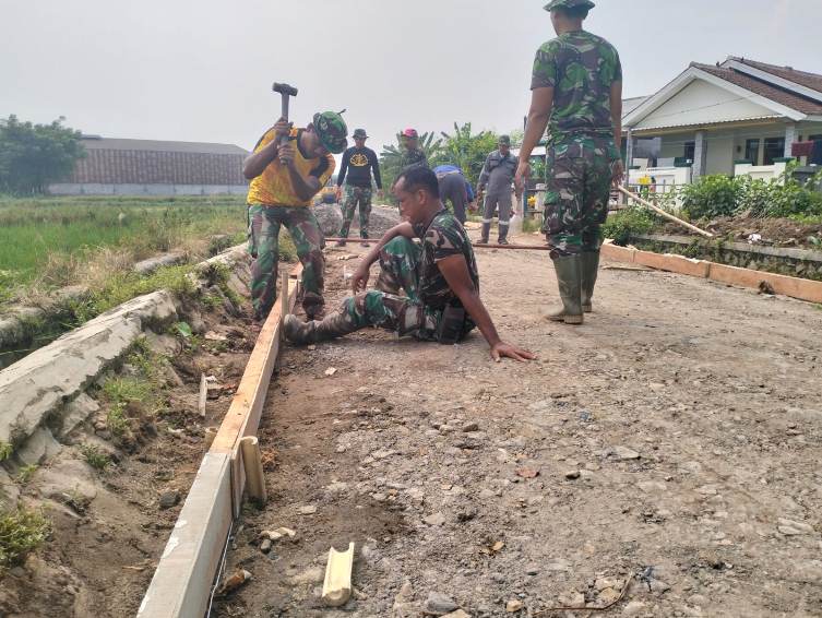 Kodam Jaya,koranpelita.co – Upaya pencapain target penyelesaian pembangunan jalan beton sepanjang 1 km lebih, Satgas TMMD ke-120 Kodim 0510/Trs, Korem 052/Wkr bersama warga memasang papan bekisting dan perkerasan menggunakan batu split dilanjutkan dengan pengecoran jalan di Kampung Bendungan Desa Gintung Kecamatan Sukadiri Kabupaten Tangerang, Minggu (12/5/2024).