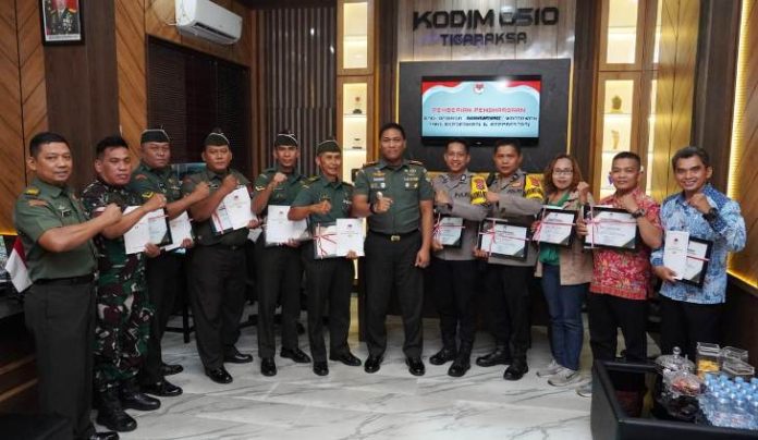 Kodam Jaya,koranpelita.co – Komandan Kodim (Dandim) 0510/Tigaraksa Letkol Arh Syarief SB memberikan penghargaan kepada dua wartawan , lima Babinsa, dua Binamas dan satu masyarakat yang dinilai berprestasi dalam tugas masing-masing.