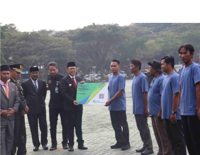 Secara simbolis, Pj Bupati Bekasi Dani Ramdan menyerahkan kartu BPJS Ketenagakerjaan kepada lima nelayan Kecamatan Muaragembong, usai Upacara Hari Lahir Pancasila, di Plaza Pemda Cikarang Pusat, pada Sabtu (01/06/2024).