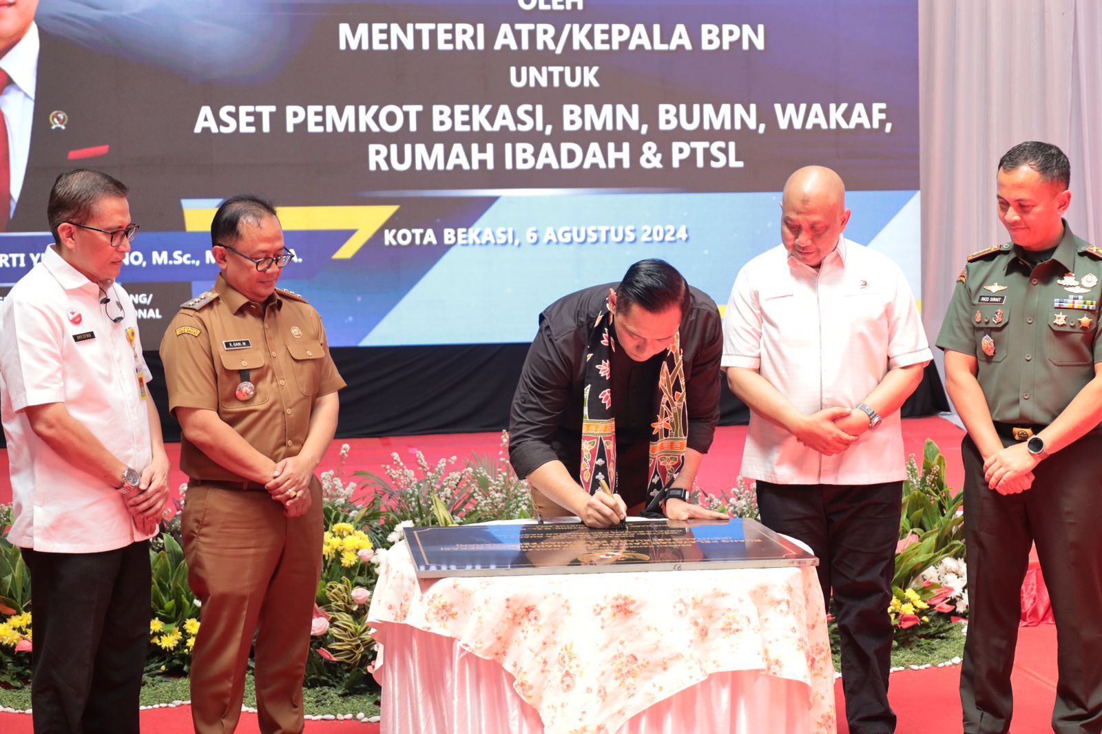 Kedatangan Menteri AHY disambut baik oleh Pj. Wali Kota Bekasi, Gani Muhamad bersama Kepala Kantor Wilayah ATR/BPN Provinsi Jawa Barat, Yuniar Hikmat Ginanjar, Kepala Kantah Kota Bekasi, Amir Sofwan, dan seluruh unsur Forkopimda Kota Bekasi.