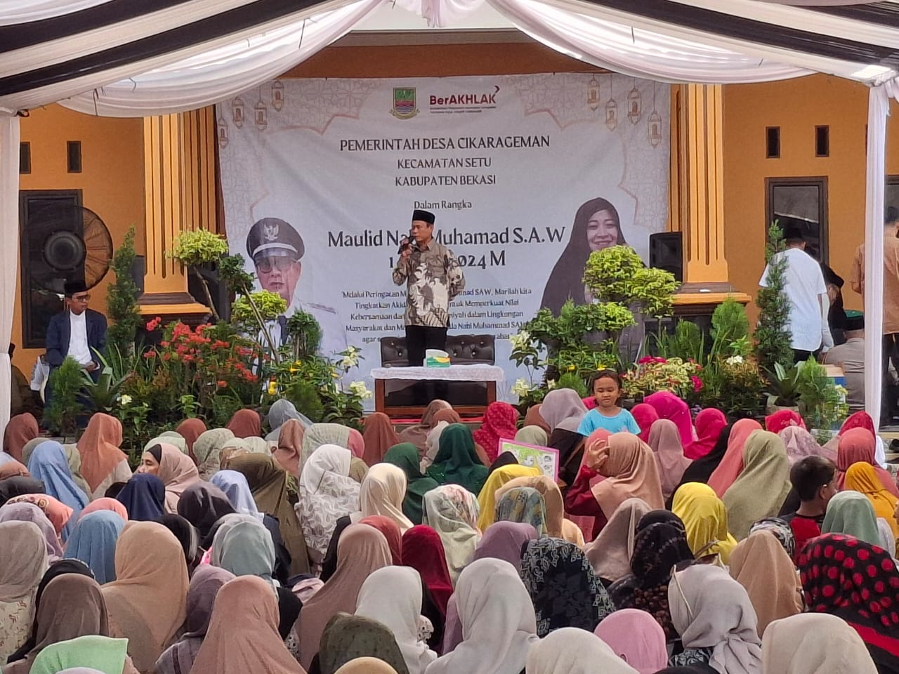 KORAN PELITA – Pemerintah Desa Cikarageman menggelar Peringatan Maulid Nabi Muhammad SAW bertempat di halaman kantor desa, Sabtu pagi, 14 September 2024.