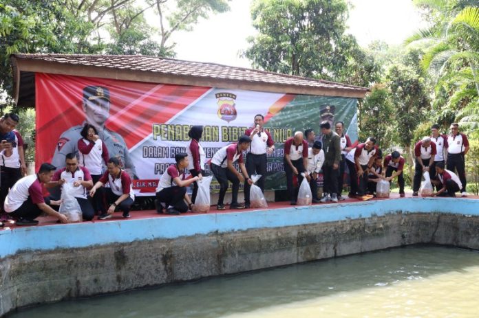 Kali ini Polda Banten menebarkan bibit ikan nila sebanyak 2000 ekor pada Kolam Polda Banten (*/sul).