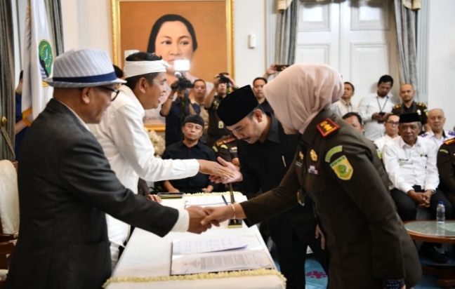 Penandatanganan MoU berlangsung di Bale Pakuan, Jl. Otto Iskandar Dinata No. 01, Kota Bandung, Selasa (14/04/2025). Selain Pemkab Bekasi, kegiatan tersebut juga diikuti oleh Kejaksaan Negeri se-Jawa Barat serta para bupati dan wali kota se-Jawa Barat.