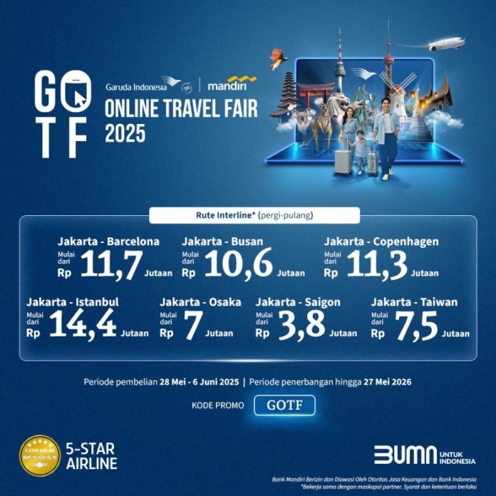Bandara Soetta,koranpelita.co – Maskapai penerbangan nasional Garuda Indonesia menyelenggarakan Garuda Indonesia Online Travel Fair (GOTF) 2025 yang tersedia selama periode pembelian mulai 28 Mei – 6 Juni 2025 untuk periode perjalanan hingga 27 Mei 2026.