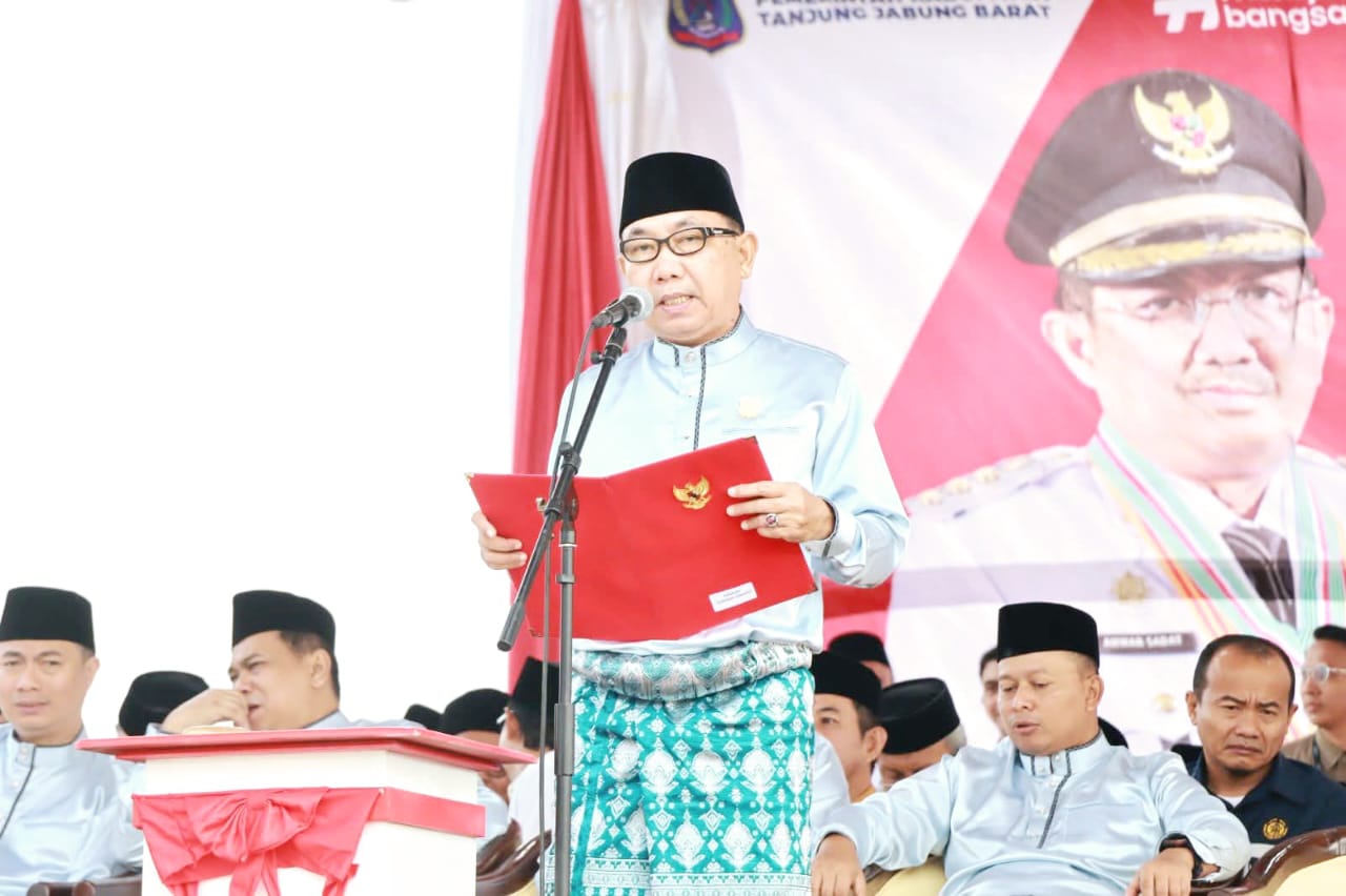 Bupati Tanjab Barat, Drs. H. Anwar Sadat, M.Ag., bertindak sebagai pembina upacara, didampingi Wakil Bupati Dr. H. Katamso SA, SE., ME.. serta Sejumlah pejabat, mulai dari Kepala Pengadilan Agama, Sekretaris Daerah, Ketua TP PKK, Ketua GOW, Ketua DWP, pimpinan instansi vertikal, BUMN, BUMD, hingga tokoh masyarakat.