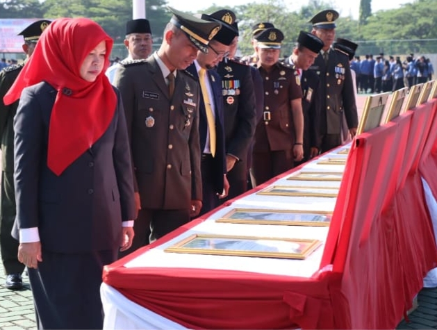 Usai melaksanakan upacara, Pj Sekretaris Daerah Kabupaten Bekasi bersama jajaran Forkopimda Kabupaten Bekasi meninjau langsung foto para pahlawan revolusi sebagai bentuk dalam mengenang jasa para pahlawan di peringatan Hari Kesaktian Pancasila tahun 2025. (Hrs).