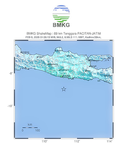 Gempa bumi terjadi pada Jumat, (6/2) pukul 01.06 WIB dengan pusat gempa berada di laut pada koordinat 8,99 LS dan 111,18 BT, sekitar 90 km Tenggara Kabupaten Pacitan, Provinsi Jawa Timur, dengan kedalaman 10 km. Guncangan dirasakan kuat selama 2–3 detik di Kabupaten Pacitan dan Kabupaten Trenggalek serta dirasakan di sejumlah wilayah di Provinsi DI Yogyakarta dan Jawa Tengah. Berdasarkan hasil analisis, gempa ini tidak berpotensi tsunami.