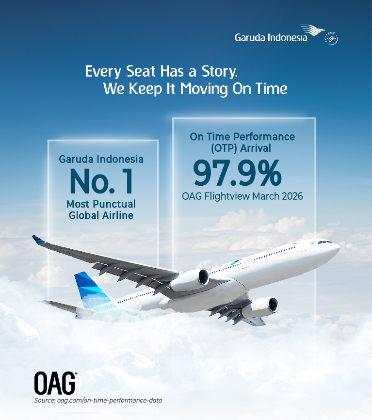 Dalam laporan tersebut, Garuda Indonesia mencatatkan tingkat ketepatan waktu (On-Time Performance/OTP) sebesar 97,9%, tertinggi di antara maskapai global.