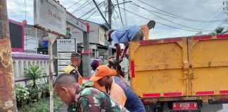 Satgas Sampah Kodim 0510/Trs Berjibaku Naikan Tumpukan Sampah ke Unit Truk